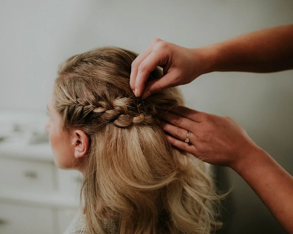 Once you have those 3 sections ready, start by bring the left section over the middle and the right over the left (which now makes it the middle) Before you bring your left section over the middle again, take a little piece of hair from the left side and combine it with that section first. Then do the same with the right side, by adding a piece of hair from the right side before you bring it over the left. Continue the braid while adding hair till right behind the ear, then finish in basic braiding style without adding hair and tie off with elastic.
