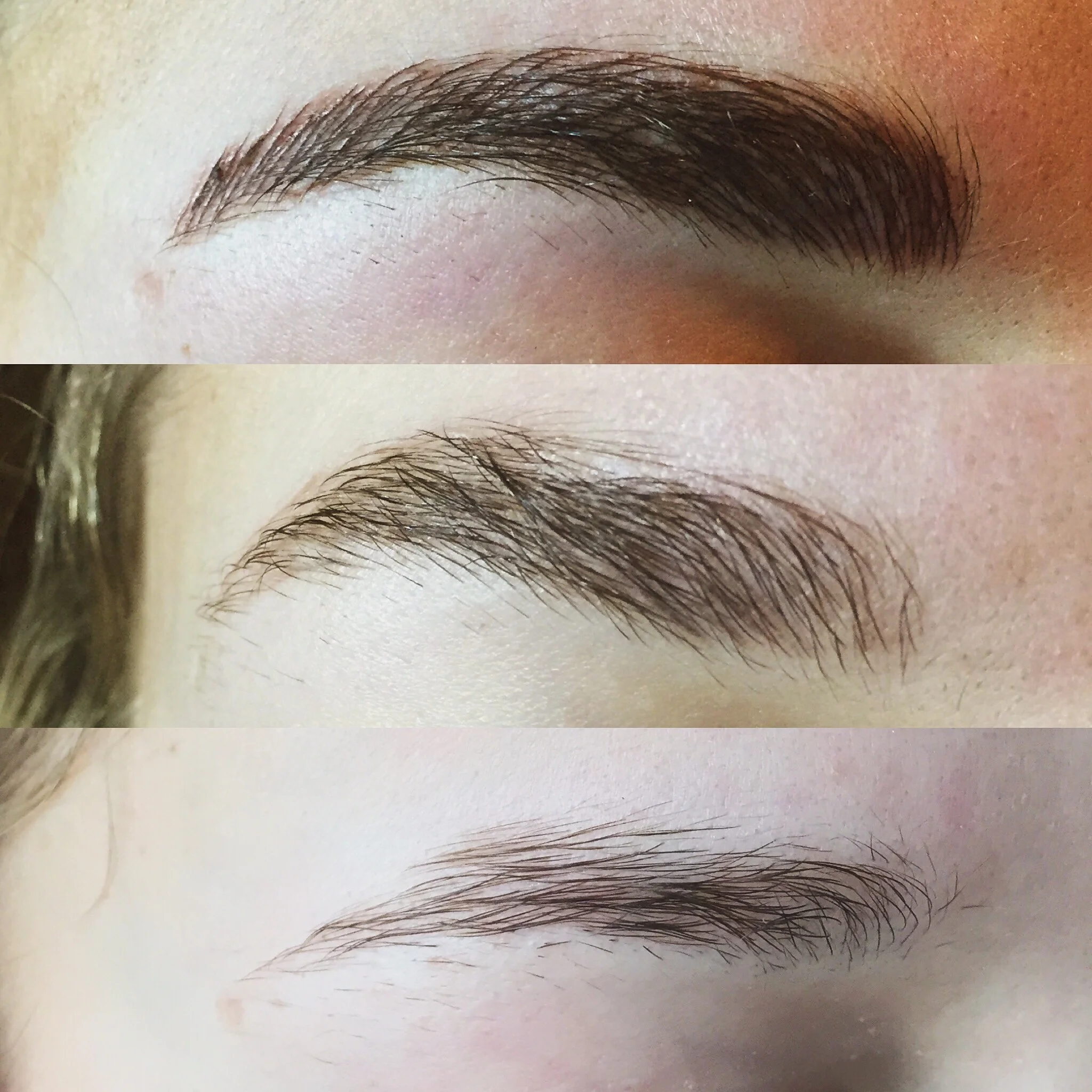 These are Marlies' brows from bottom to top, naked brow, healed after one session, and immediately after the touch up.